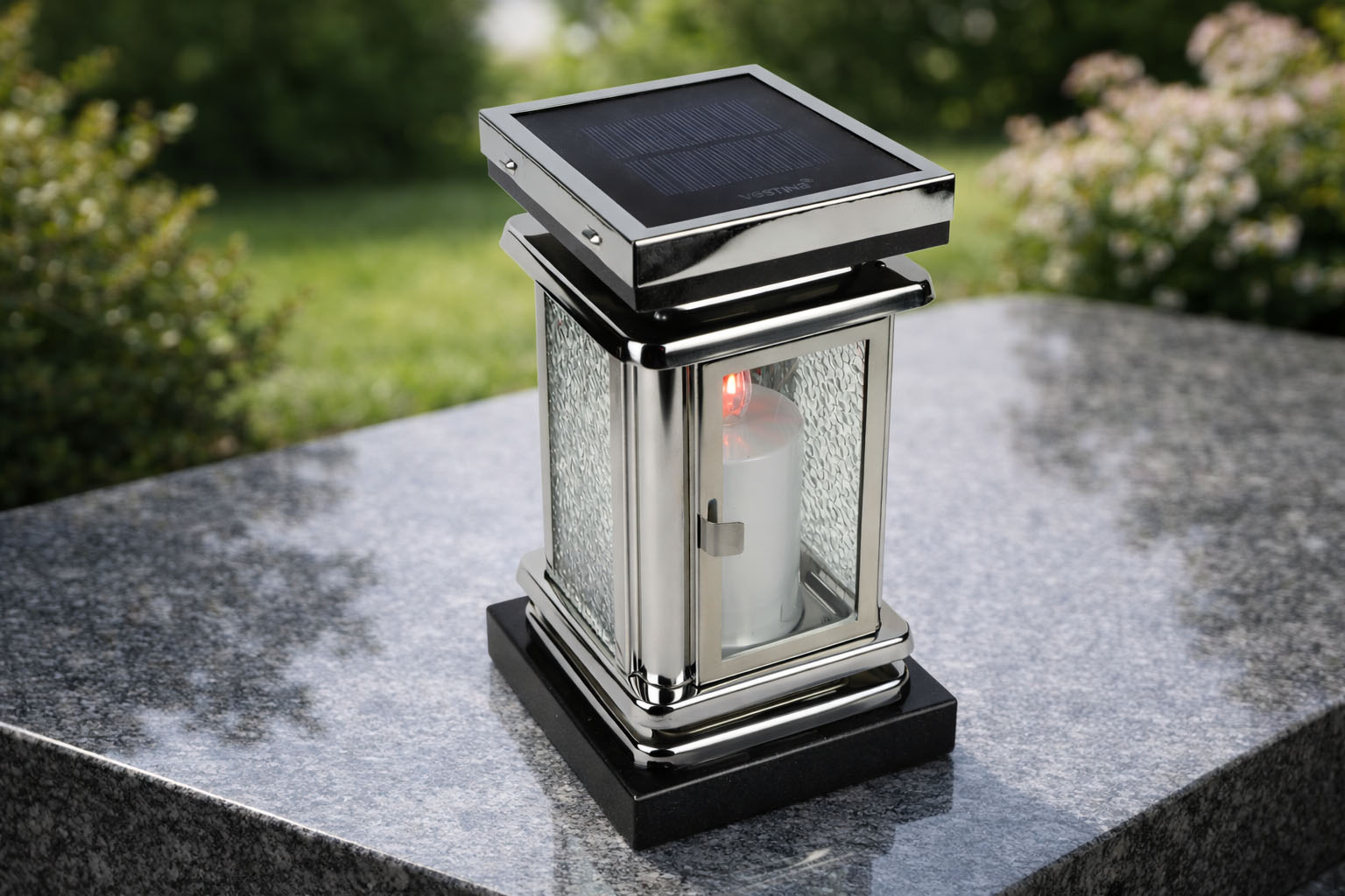 Kompaktowe wymiary lampionu – 11×11 cm i wysokość 23 cm, zapewniają mu wyrazisty charakter, natomiast możliwość wygrawerowania inicjałów dodaje mu personalnego charakteru. Zastosowanie znicza LED zasilanego energią słoneczną z panelu solarnego umieszczonego na górnej granitowej pokrywie sprawia, że latarenka będzie świecić przez cały rok, co czyni ją wspaniałym rozwiązaniem na różne okazje.